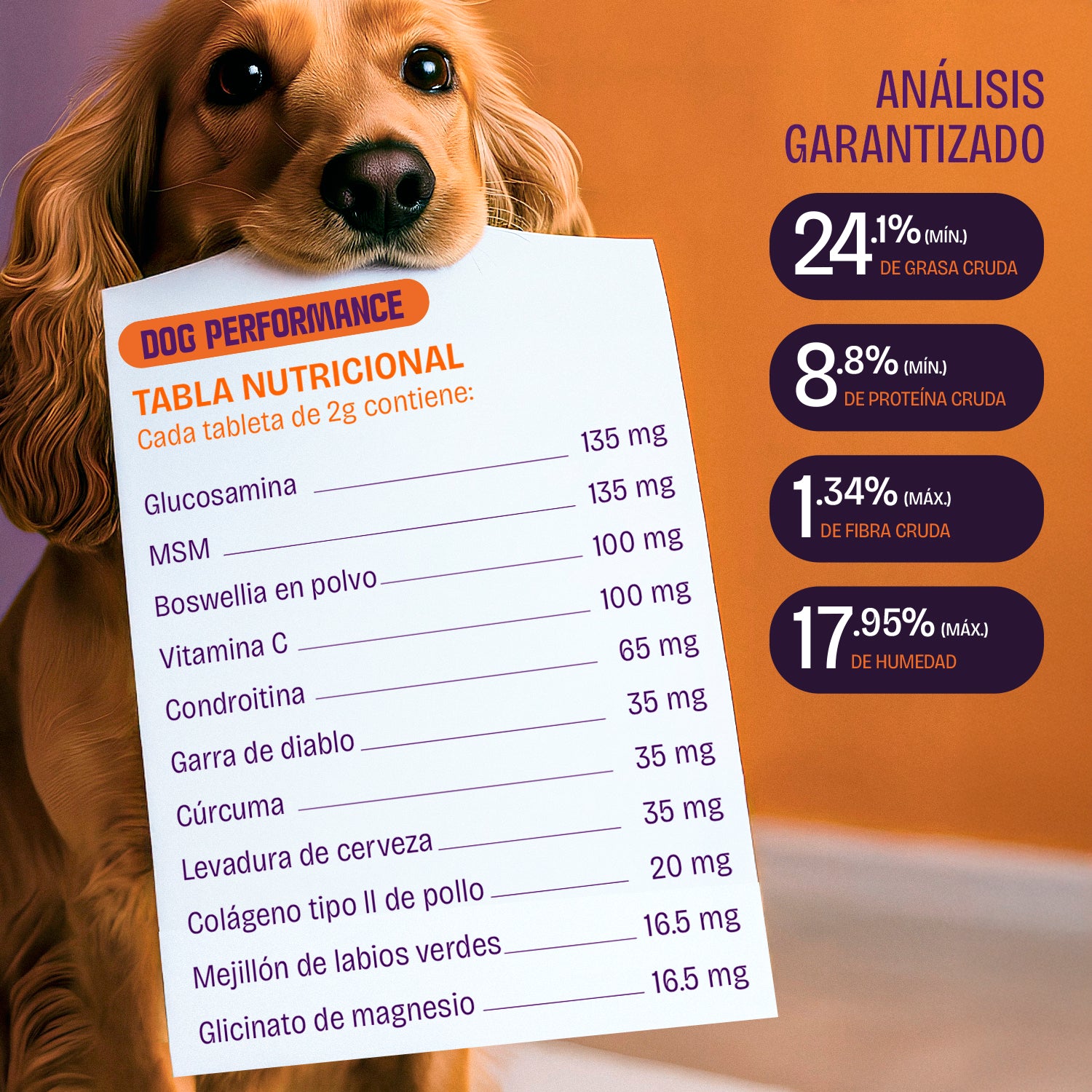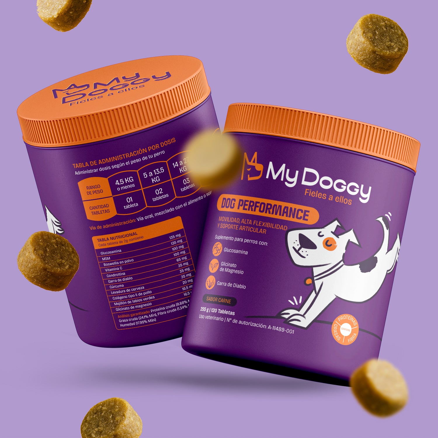 Tu perro confía en ti para su bienestar, y tú puedes confiar en Dog Performance para darle el soporte que necesita. Este suplemento alimenticio ha sido diseñado para actuar de forma integral en el sistema articular, ayudando a prevenir el desgaste progresivo, reducir la inflamación y favorecer la reparación natural del cartílago y ligamentos.